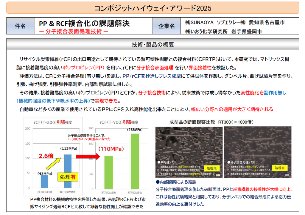 弊社は分子接合処理をした「RCFとPPをマトリックスとした複合材」の引張強度や曲げ強度を、従来品の数倍以上に増加させる技術を開発。分子接合剤を介してRCFとPPを化学結合でつなぎ合わせることで、複合材の機械強度が大幅に改善する点が評価され、コンポジットハイウェイ・アワード2025において準グランプリを受賞いたしました。